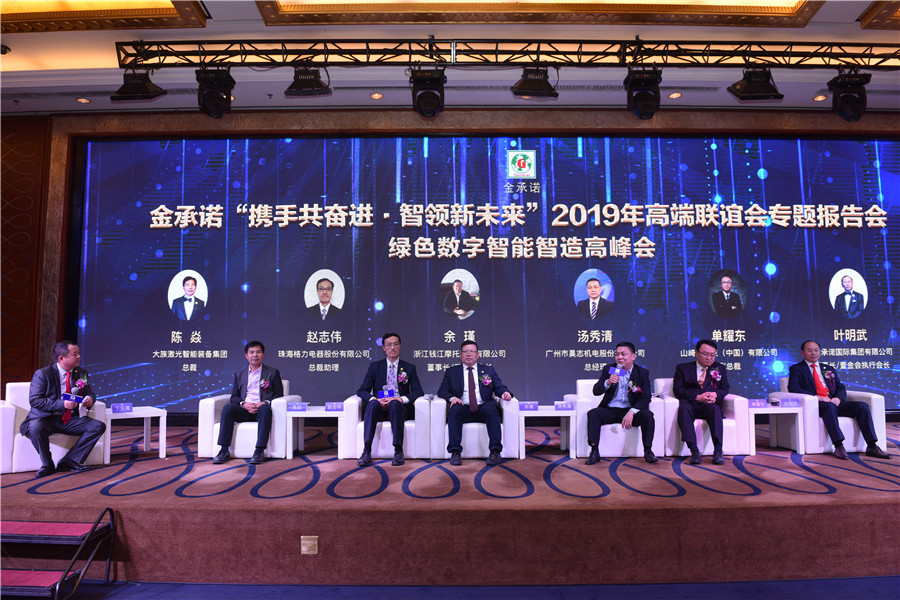 同時(shí),我們還在專題報告會中增加了(le)“綠(lǜ)色數(shù)字智能(néng)智造高峰會”環節,邀請(qǐng)金(jīn)承諾+全産業鏈互利共赢生态圈各企業領導,包括:大族激光(guāng)智能(néng)裝備集團有限公司陳焱總經理、珠海(hǎi)格力電器股份有限公司趙志偉總裁助理、浙江錢(qián)江摩托股份有限公司餘瑾董事長(cháng)、廣州昊志機電股份有限公司湯秀清總經理、山(shān)崎馬紮克(中國(guó))有限公司單耀東副總裁、金(jīn)承諾國(guó)際集團有限公司葉明(míng)武董事長(cháng)上(shàng)台與大家分享綠(lǜ)色數(shù)字智能(néng)智造方面的認識和(hé)實踐。